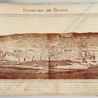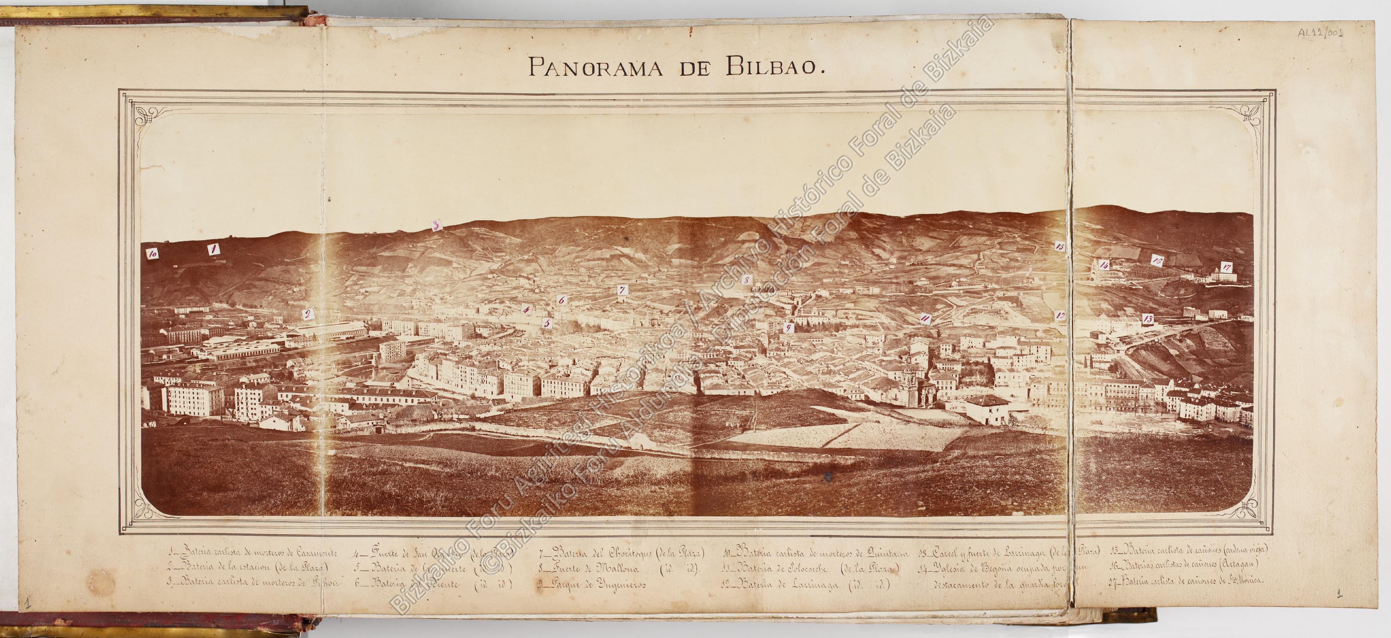 Toma panorámica de Bilbao desde el alto de Mirabilla. Al pie de la fotografía están señaladas las baterías y puntos en los que se sitúan las tropas de los ejércitos liberal y carlista durante El Sitio carlista de Bilbao.