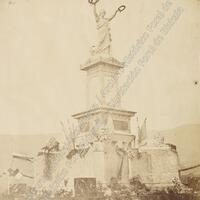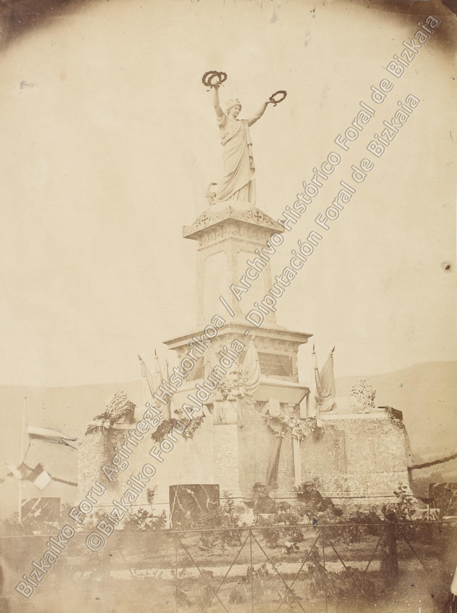 Toma general del monumento a los Mártires de la Libertad, engalanado con dos niños a sus pies. Este monumento fue levantado en el cementerio de Mallona de Bilbao en honor a los defensores de la villa durante los distintos asedios carlistas.