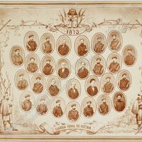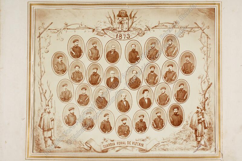 Retratos de torso en mosaico de imágenes camée de los miembros de la Diputación y oficiales y suboficiales de la Guardia Foral de Vizcaya en 1873. El tercero de izquierda a derecha de la línea superior es José María Murga, el Moro Vizcaíno, a la sazón Presidente de la Diputación. La orla aparece enmarcada por una litografía con dos miñones a los lados, motivos vegetales y un escudo de Vizcaya rematando la imagen. Retratos atribuidos a Carlos Monney.