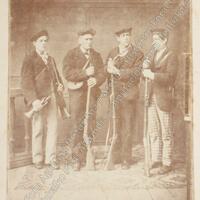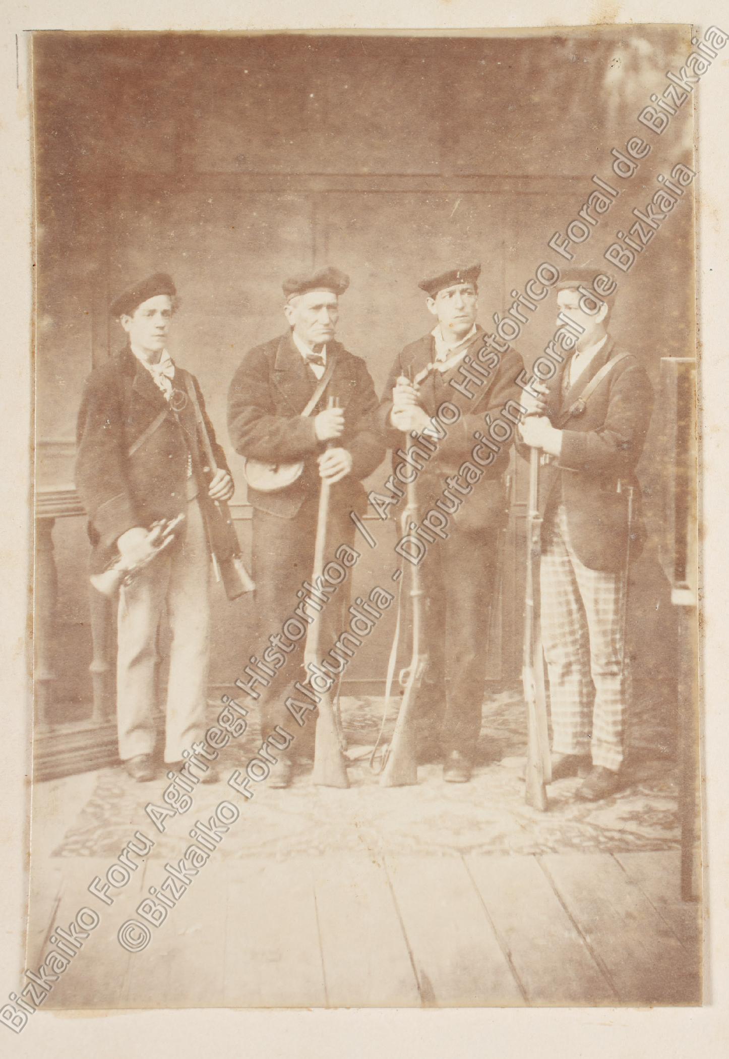 Retrato de grupo de voluntarios auxiliares liberales, defensores de Bilbao durante El Sitio carlista de 1874, con sus respectivos mosquetones. Retrato de estudio atribuido a Carlos Monney, que estaba en el número quince de la calle Correo de Bilbao.