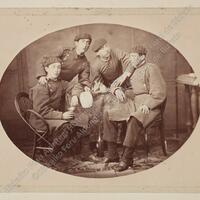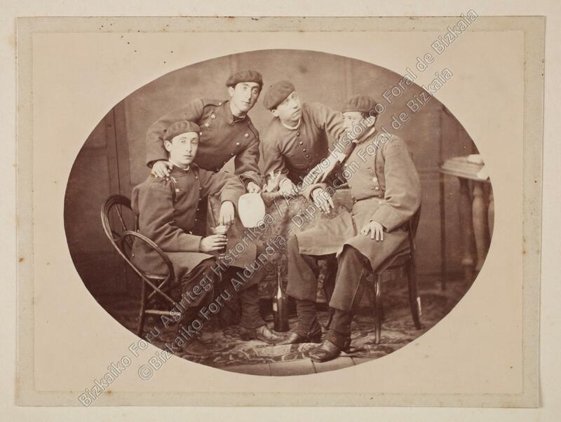 Retrato de grupo de guardias forales de Vizcaya de francachela, defensores de Bilbao durante El Sitio carlista de 1874. Retrato de estudio atribuido a Carlos Monney, que estaba en el número quince de la calle Correo de Bilbao.