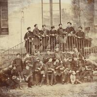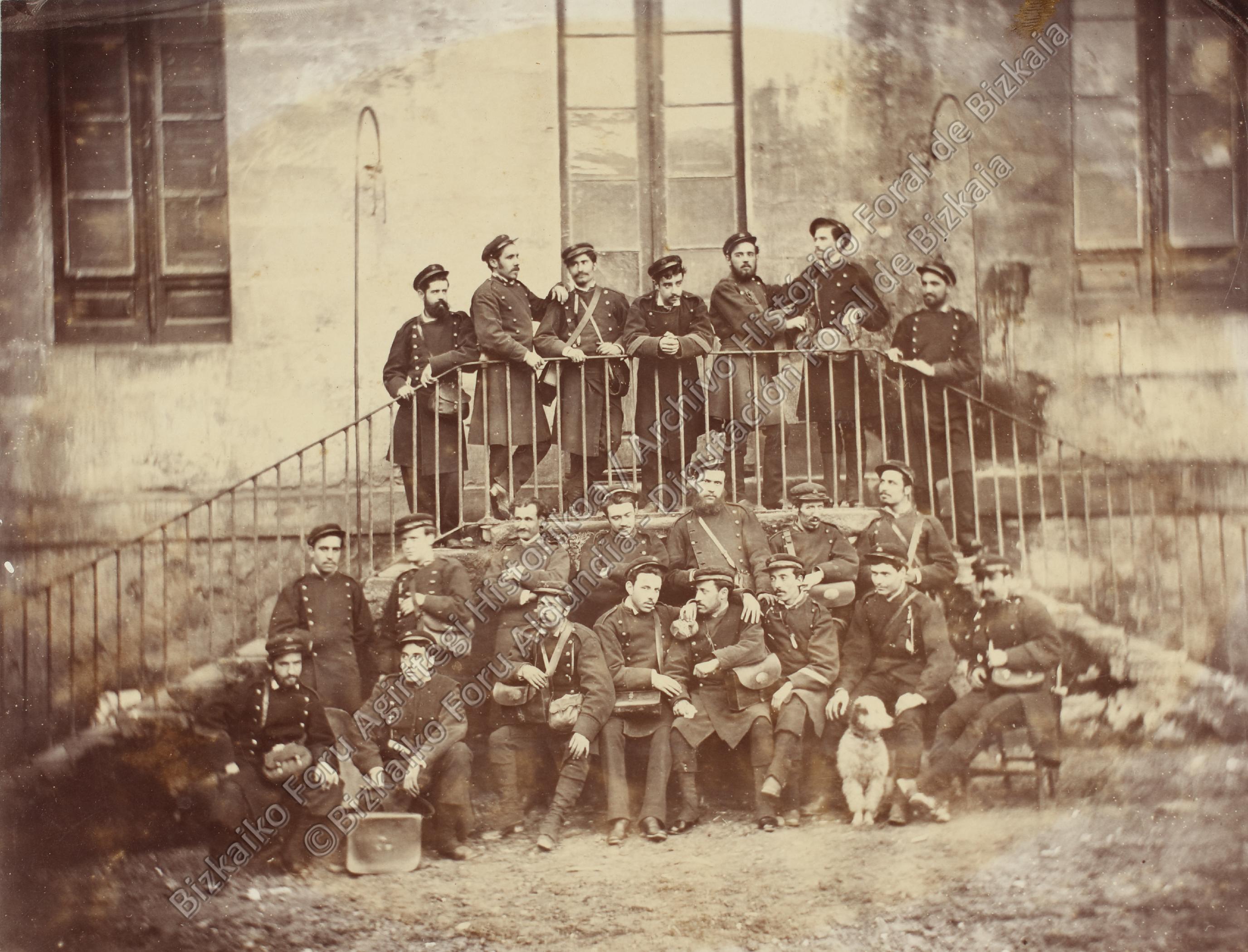 Retrato de grupo perteneciente a la sanidad militar, que participó en la defensa de Bilbao durante El Sitio carlista de 1874. En el grupo también aparece un perro. Fotografía atribuida a Carlos Monney.