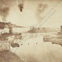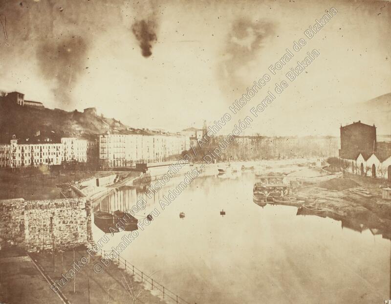 Primer día de bombardeo. Toma parcial de Bilbao desde el fuerte de San Agustín, en la que aparecen embarcaciones en la ría de Bilbao, amarradas en los muelles de Ripa y El Arenal, mientras en el cielo hay rastros del bombardeo que la villa sufre durante El Sitio carlista de 1874. En un primer plano, a la izquierda de la imagen, la batería de la Marina. Atribuida a Carlos Monney.