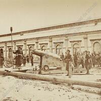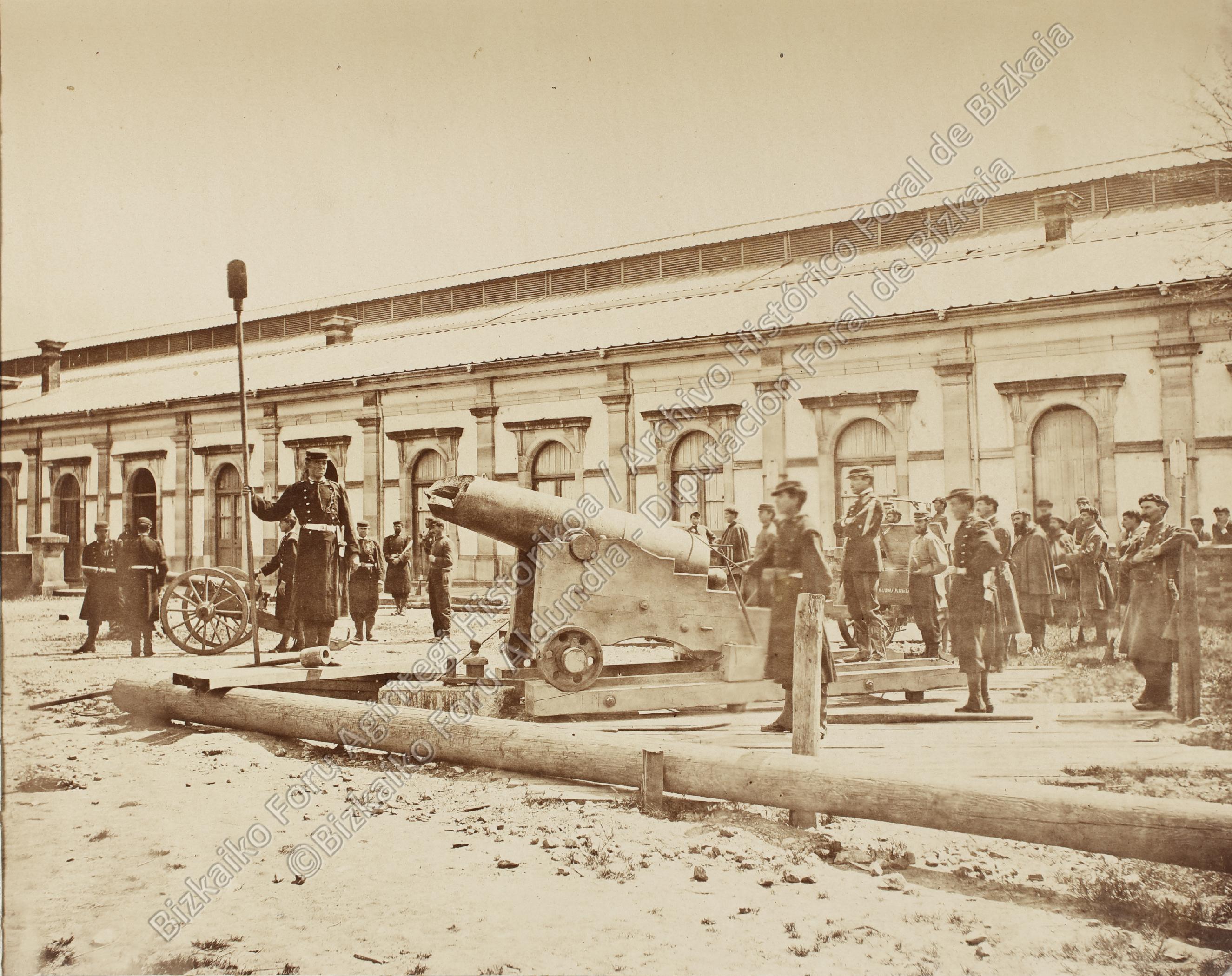 Toma general de la batería ubicada en la estación del ferrocarril de Abando con militares del ejército liberal y guardias forales de Vizcaya a su cargo, durante El Sitio carlista en 1874.