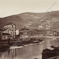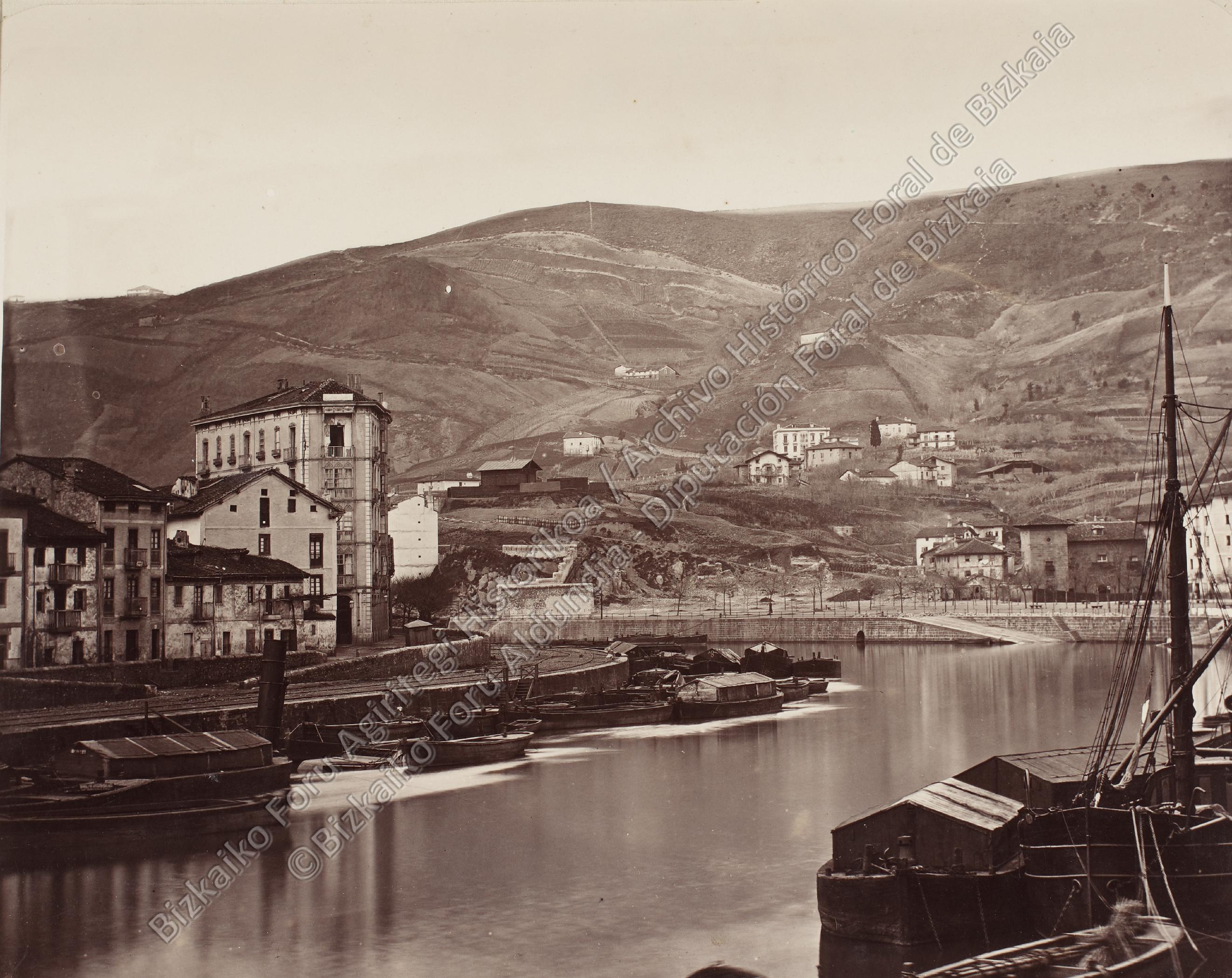 Toma parcial de la ría Bilbao desde Ripa durante El Sitio carlista de Bilbao en 1874. En un primer plano, embarcaciones amarradas a los muelles; en un segundo plano, el fuerte de San Agustín, la puerta y batería de la Marina; a la derecha, el palacio "Quintana" frente al muelle de Sendeja y, al fondo, el monte "Archanda".