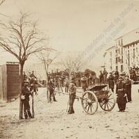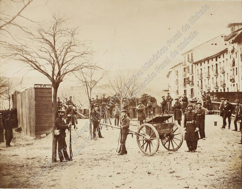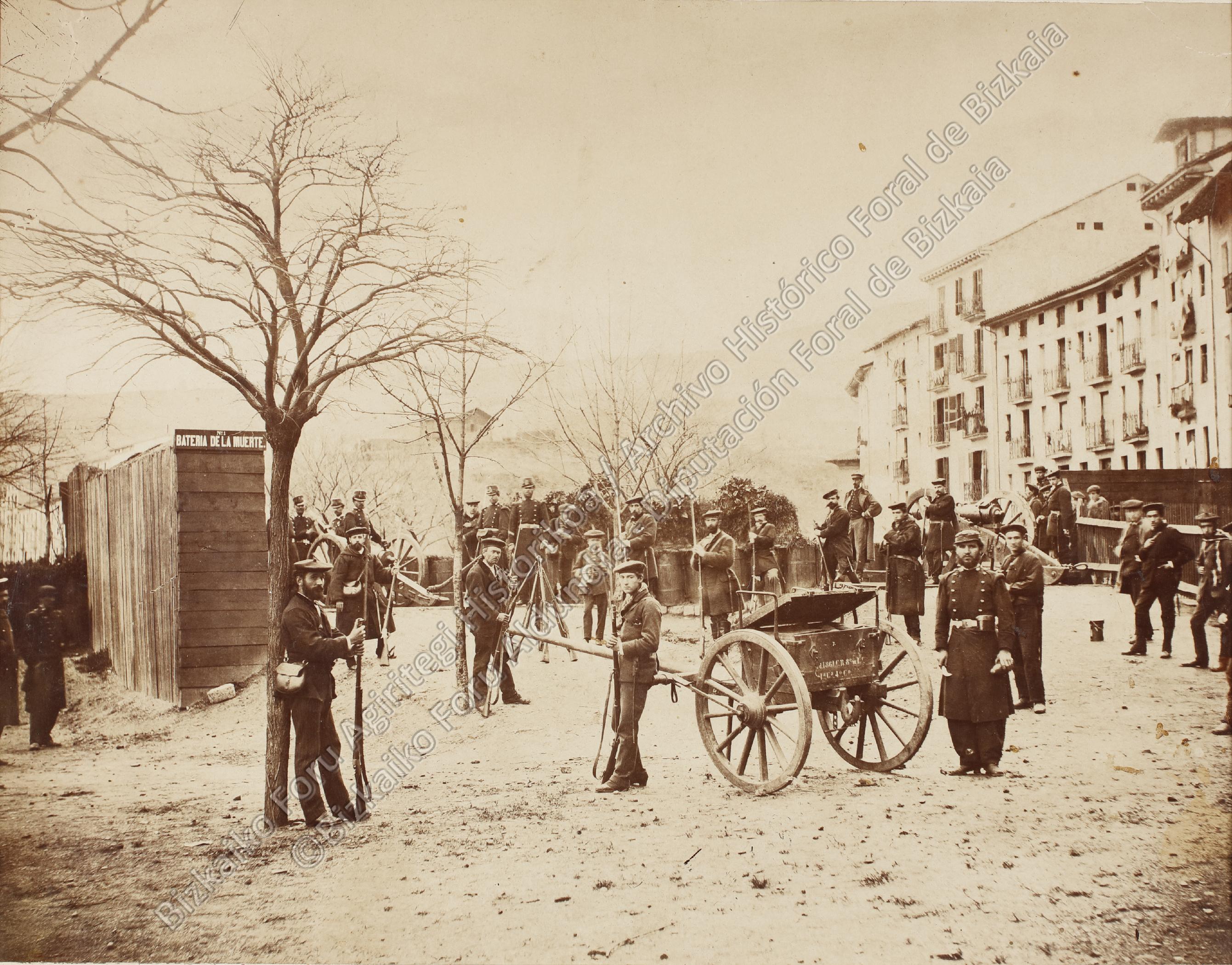 Retrato de la guarnición de la batería de la Muerte, situada en la Sendeja, en la que aparecen soldados y voluntarios auxiliares liberales con su armamento en posición de descanso durante El Sitio carlista de Bilbao de 1874.