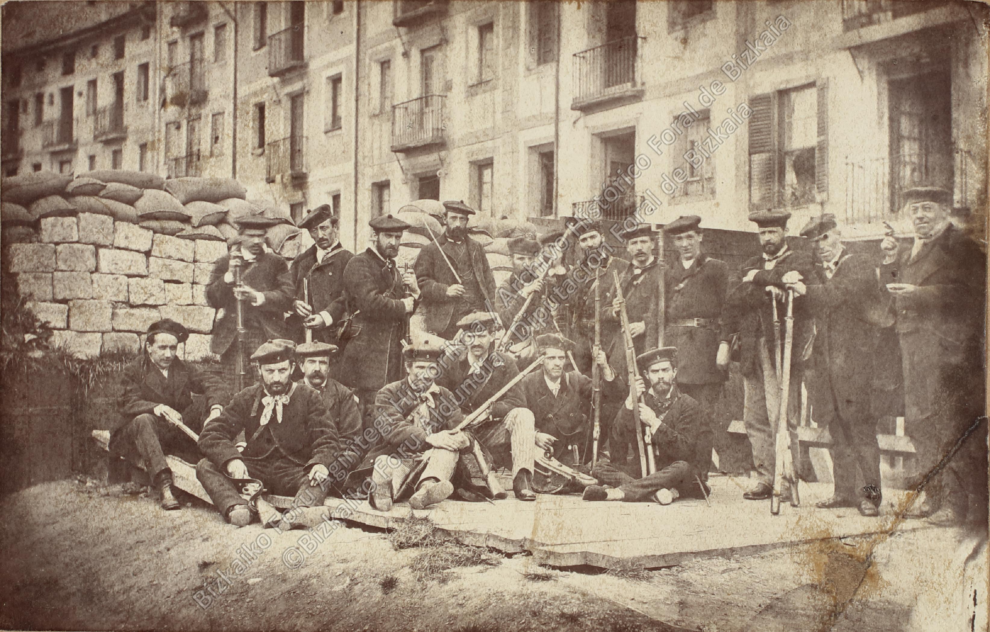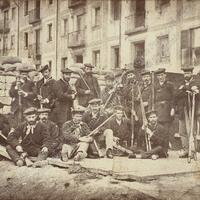 Retrato de grupo de voluntarios auxiliares liberales en una barricada de la Sendeja de Bilbao con su armamento durante El Sitio carlista de 1874. Retrato atribuido a Carlos Monney.