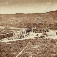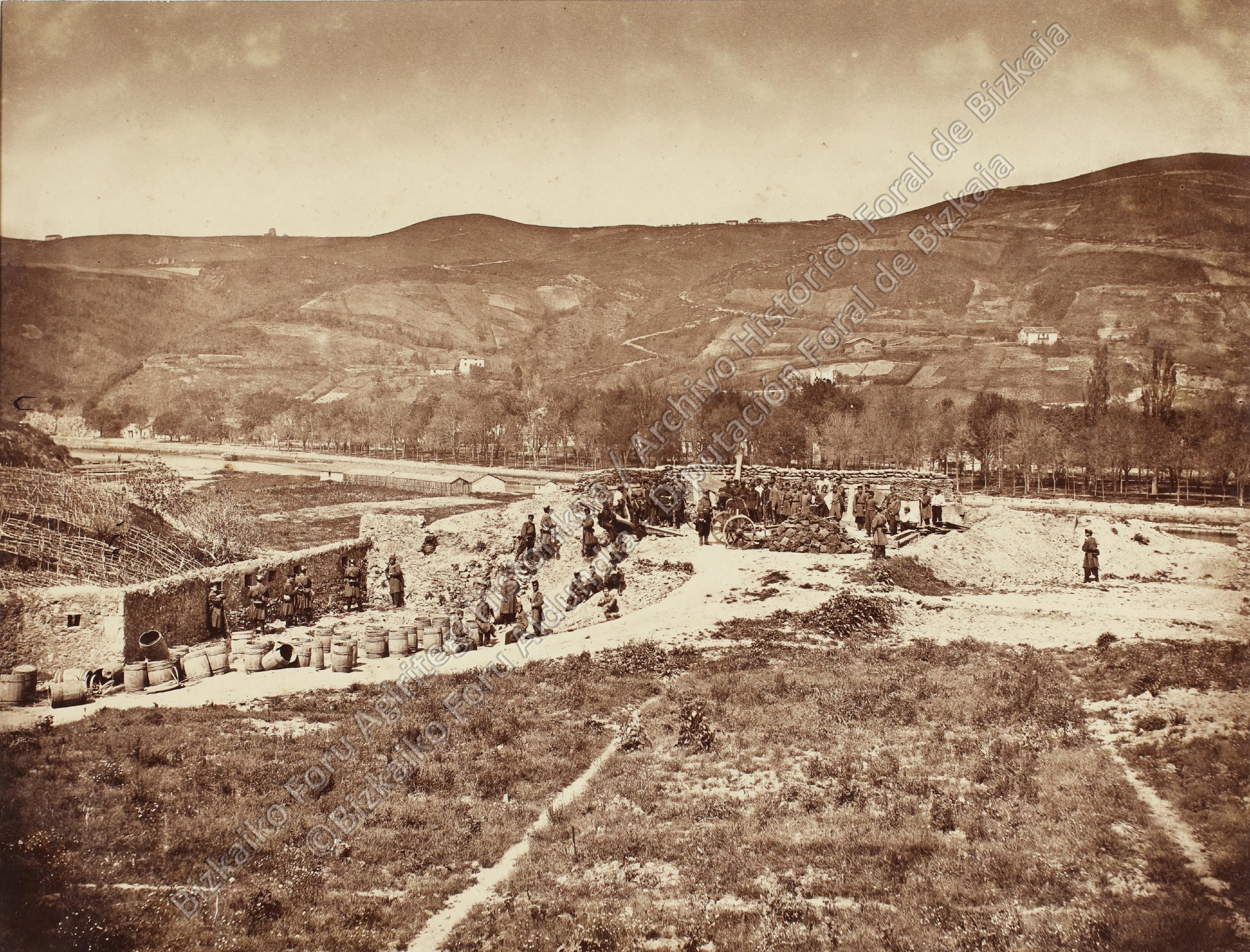Toma general de la batería de la Brigadiera, situada en el cementerio de Albia, durante El Sitio carlista de Bilbao en 1874. Aparece la guarnición de la batería en un momento de descanso con su armamento y numerosos barriles; en un segundo plano, el paseo del Campo Volantín y el monte "Archanda" .