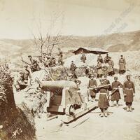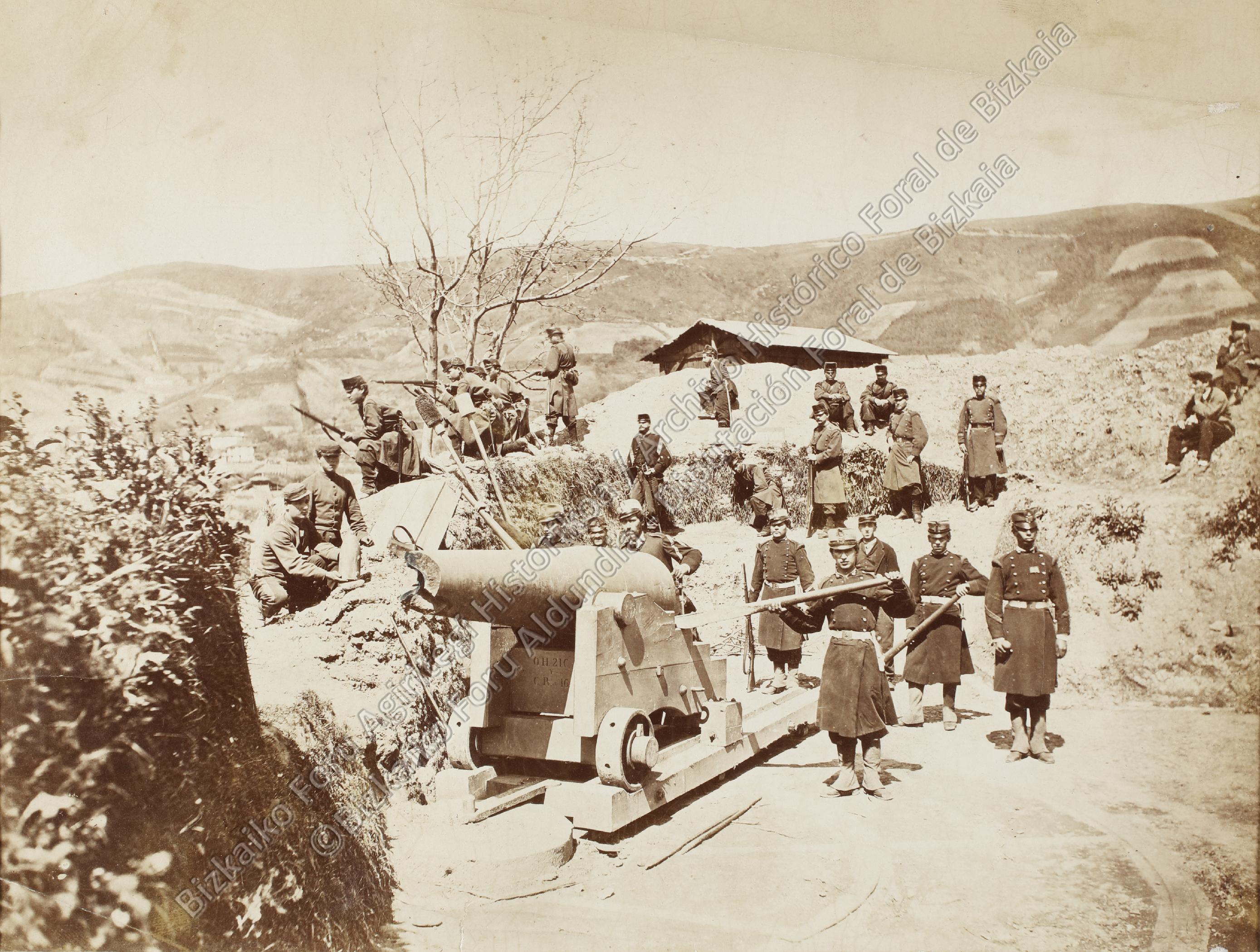 Retrato de grupo de la guarnición de la batería del Choritoqui, con el monte Archanda al fondo, durante El Sitio carlista de Bilbao de 1874. En la imagen, los soldados posan con un cañón en posición de combate para el fotógrafo, mientras dos civiles les observan desde una esquina.