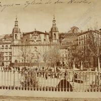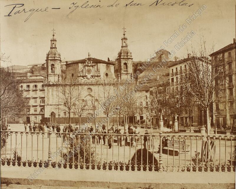 Toma parcial del parque de El Arenal con la iglesia de San Nicolás al fondo durante El Sitio carlista de Bilbao en 1874. En la fotografía aparece un grupo de personas, militares y civiles, posando para el fotógrafo.