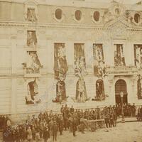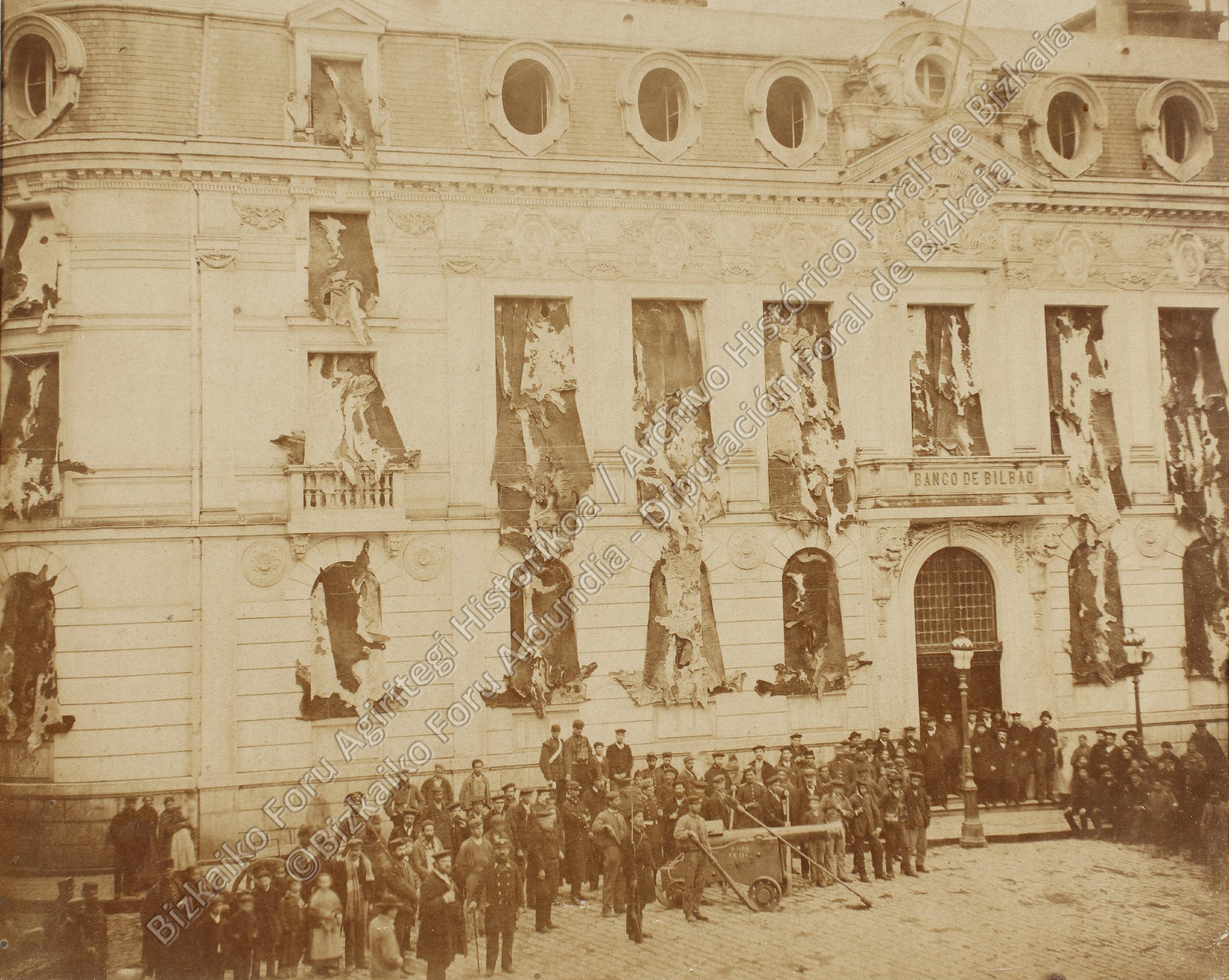 Retrato de la guarnición de la batería situada frente a la fachada principal del Banco de Bilbao, en la plazuela de San Nicolás, durante El Sitio carlista de Bilbao de 1874. En la imagen, soldados y voluntarios posan con un gran cañón frente a la fachada de dicho banco, que aparece protegido por pieles de vacuno en sus ventanas.