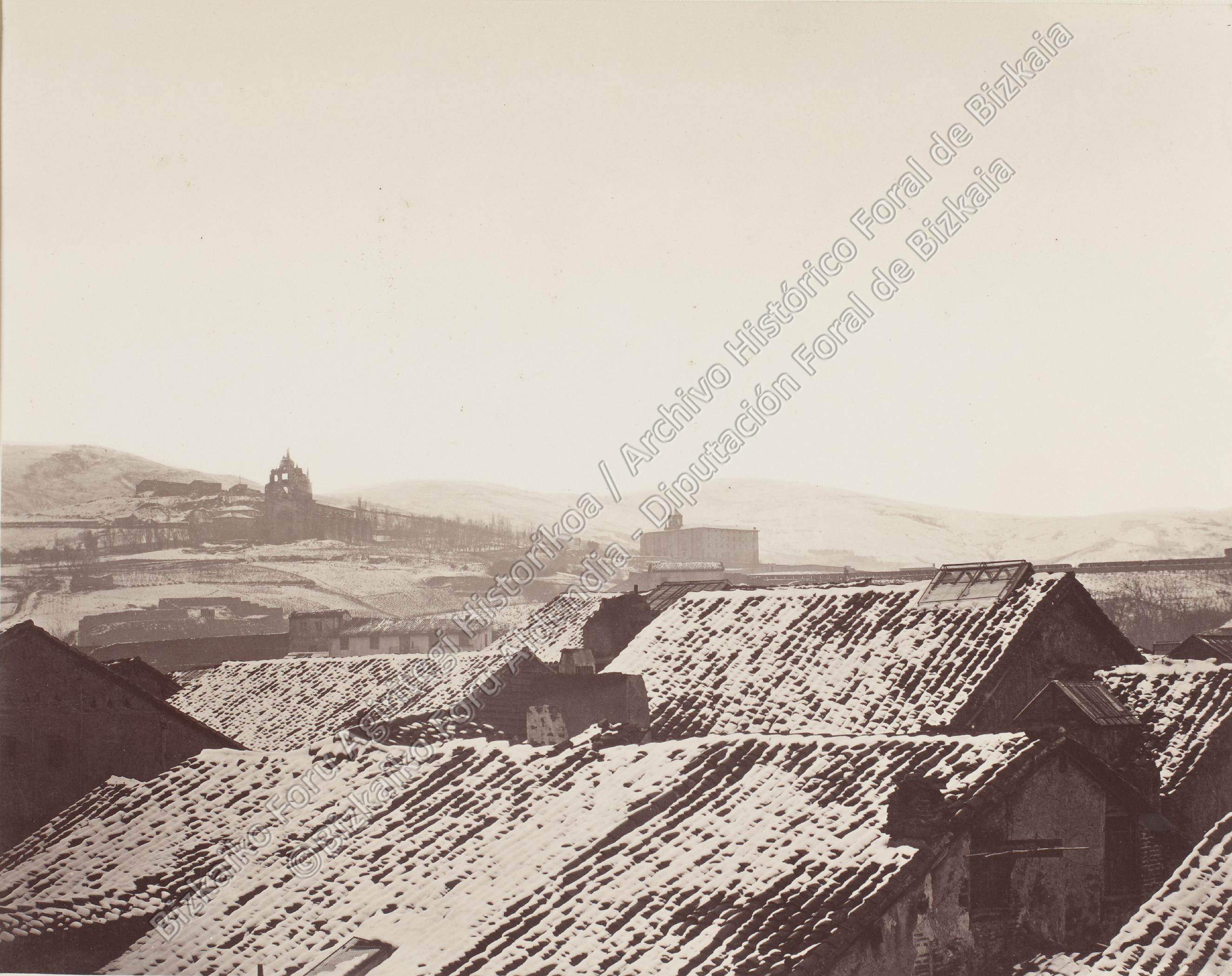- ES Toma general de Artagan con la iglesia de Nuestra Señora de Begoña y el convento de Santa Mónica, en Begoña, bajo la nieve durante El Sitio carlista de Bilbao de 1874.