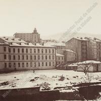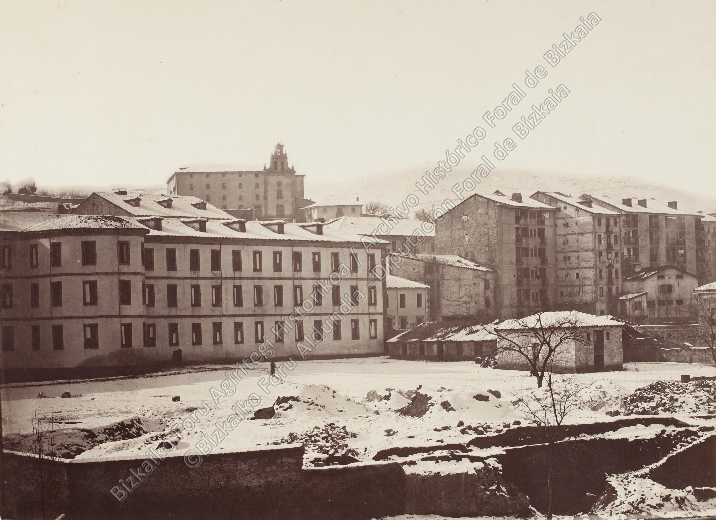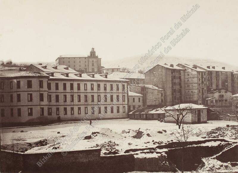 Toma parcial del cuartel Príncipe Alfonso en el barrio de San Francisco, Bilbao; al fondo, el convento de Nuestra Señora de la Concepción de Abando tras una nevada durante El Sitio carlista de Bilbao en 1874.