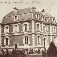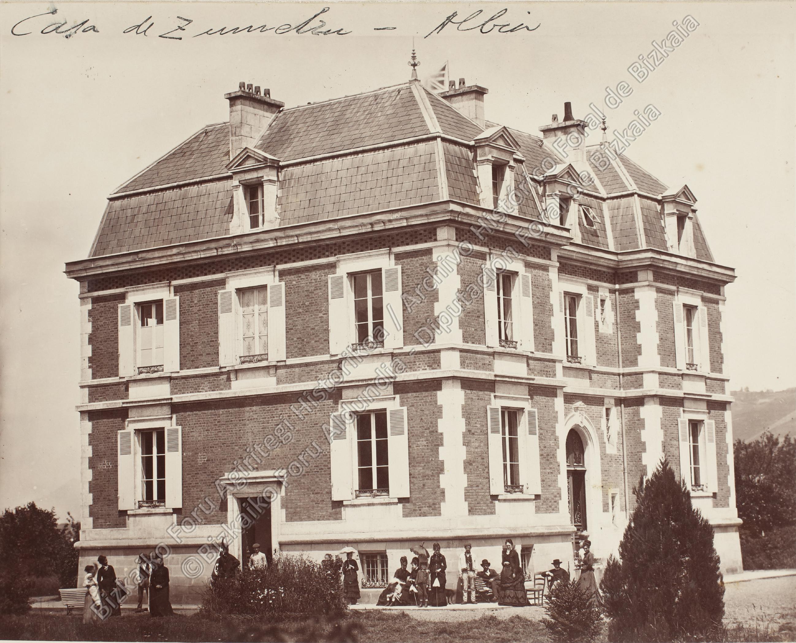 Toma general del exterior de la casa Zumelzu, en Albia, anteiglesia de Abando, en la que aparecen sus moradores mirando a la cámara. Probablemente era la sede del consulado británico en el momento de la toma, durante El Sitio carlista de Bilbao de 1874, puesto que en su tejado ondea la bandera del Reino Unido.