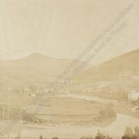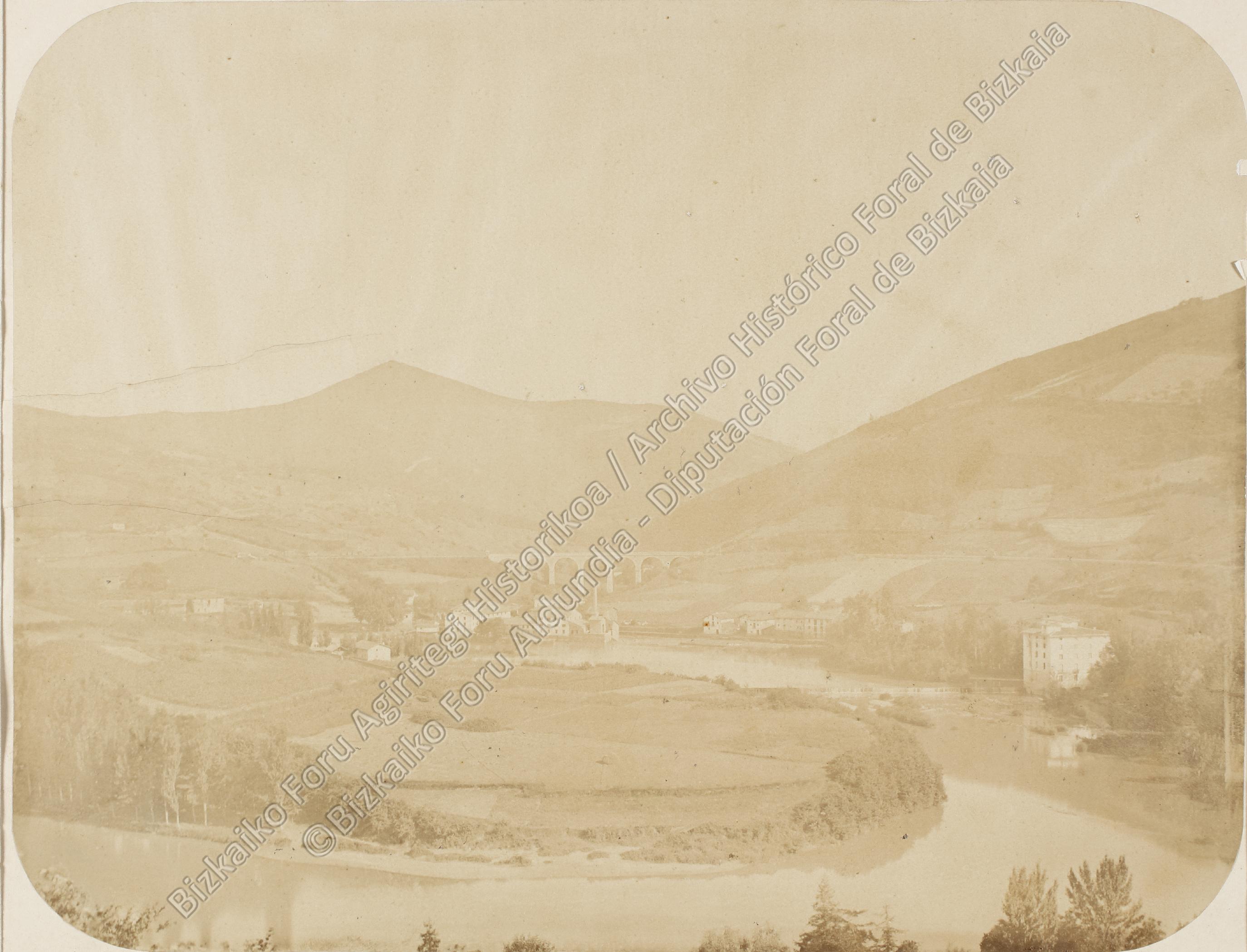 - ES Toma general del barrio de La Peña o Abusu, en Bilbao, en la que destacan el viaducto del mismo nombre y la ría de Bilbao; al fondo, Montefuerte.