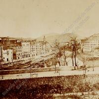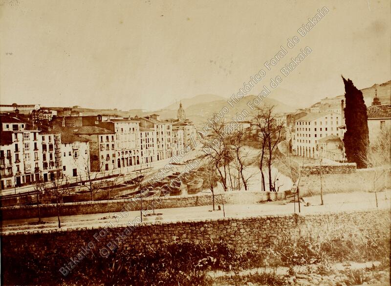 Toma parcial de la calle y muelle de La Ribera desde La Naja, en Abando, durante El Sitio carlista de Bilbao de 1874. A la izquierda de la imagen, embarcaciones varadas en la ría con la marea baja, y, a la derecha, desde la altura de la iglesia y convento de Nuestra Señora de la Merced hasta las casas baratas de Marzana frente a la iglesia y puente de "San Antón".