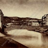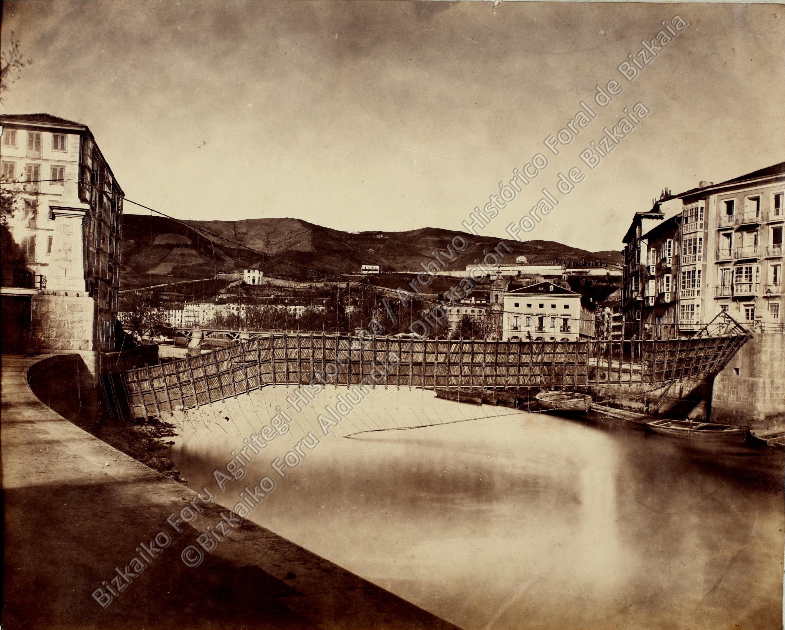 Toma general del puente colgante de Los Fueros sobre la ría de Bilbao destruido por las bombas durante El Sitio carlista de Bilbao en 1874. En un segundo plano, la fachada posterior del teatro de la villa y numerosas gabarras atracadas al muelle de El Arenal.