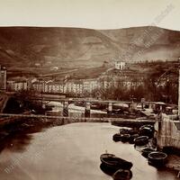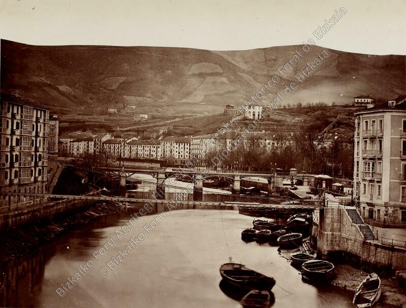 Toma general de los puentes de El Arenal y el colgante de los Fueros sobre la ría de Bilbao con numerosas gabarras y embarcaciones de menor porte amarradas a su muelle durante El Sitio carlista de Bilbao de 1874. En un segundo plano, el parque de El Arenal y al fondo el monte "Archanda".