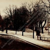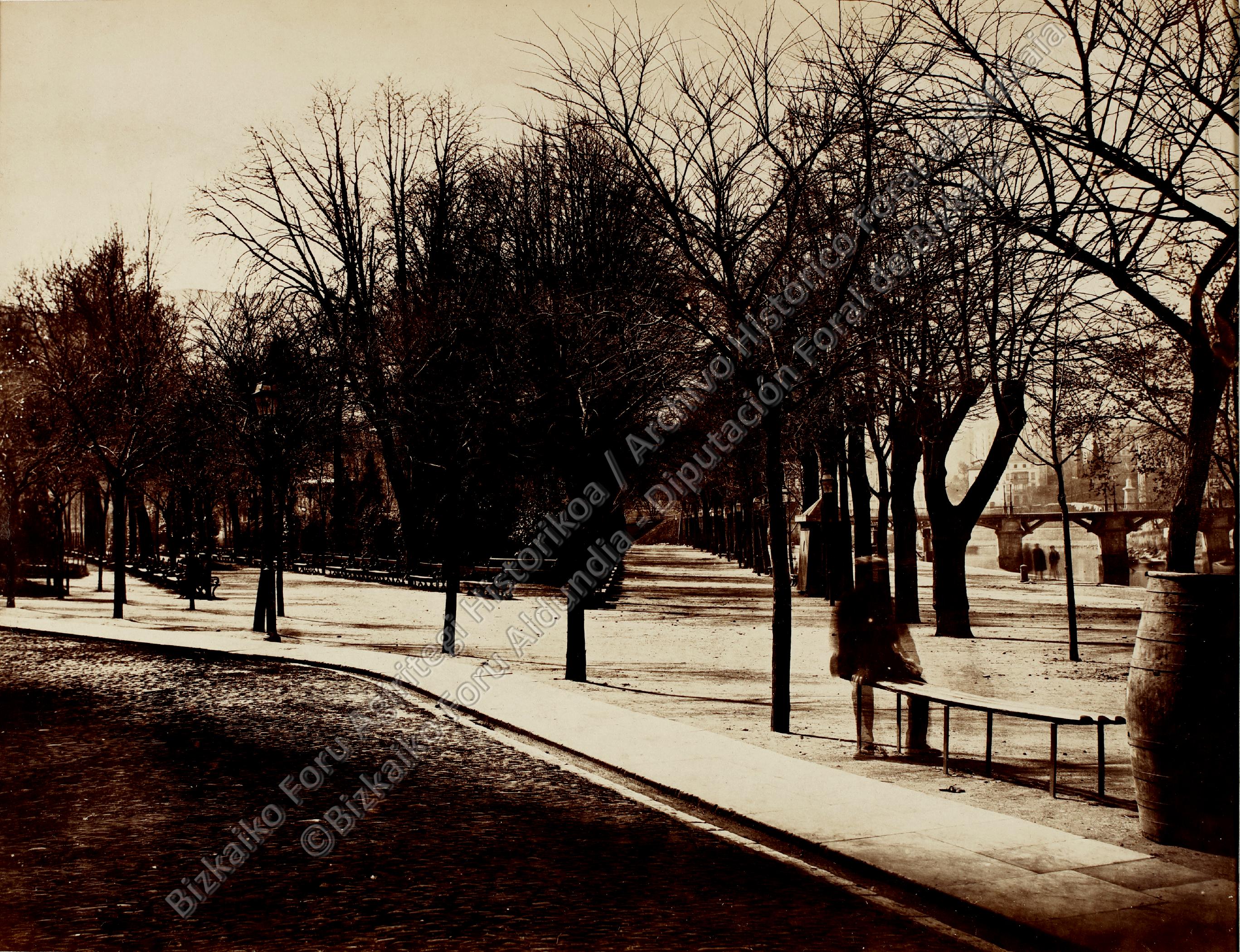 - ES Toma parcial del parque de El Arenal desde la calle Estufa, con el puente de aquél nombre. En la imagen aparece un hombre sentado en un banco junto a un barril.