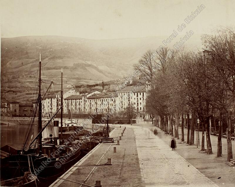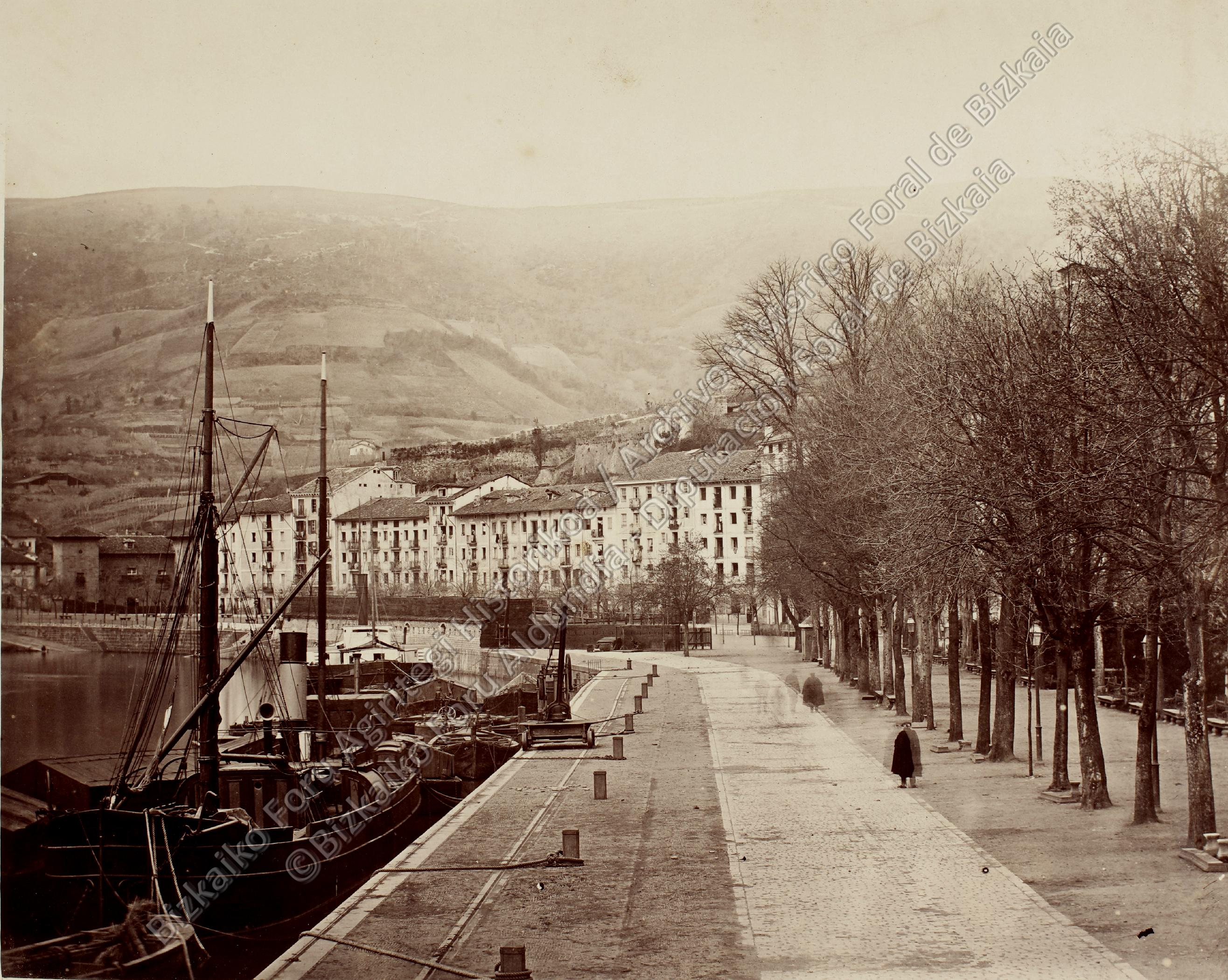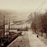 Toma general de los muelles de El Arenal y Sendeja junto a la ría durante El Sitio carlista de Bilbao de 1874. En la imagen, vapores y otras embarcaciones atracadas y algunas personas paseando hacia la fortificación levantada entre los mencionados muelles . Al fondo, a la izquierda de la imagen, destaca el palacio "Quintana".