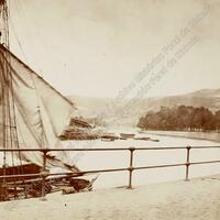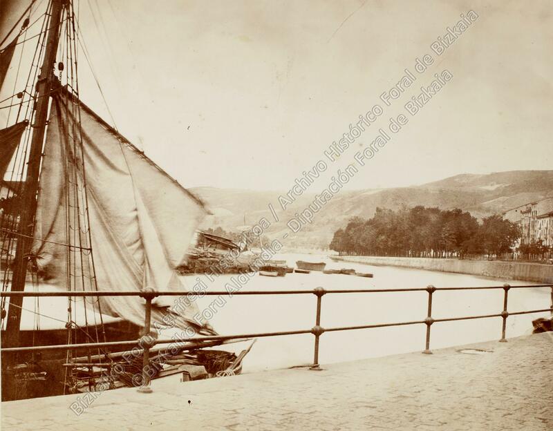 Toma parcial de la ría de Bilbao a la altura de San Agustín y el Campo Volantín desde el veril del muelle de Sendeja; a la izquierda de la imagen, el palo de mesana y la vela cangreja de un velero amarrado en dicho muelle.