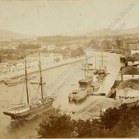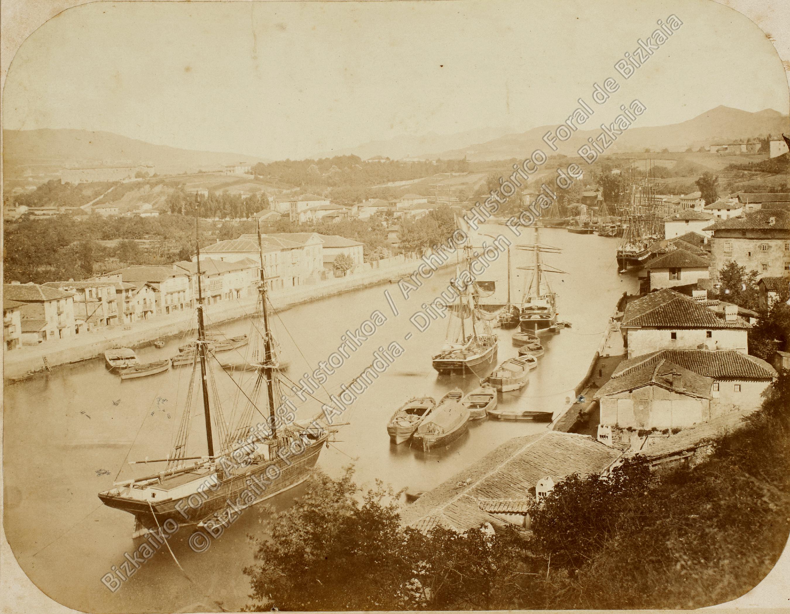 - ES Toma parcial de la ría de Bilbao a su paso por Olabeaga y la Ribera de Deusto, en la que se pueden observar veleros, gabarras y otras embarcaciones, fondeados junto a los muelles.