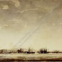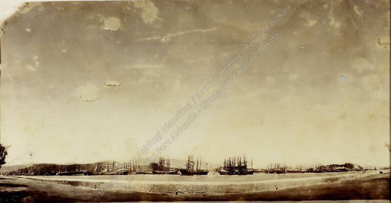 - ES Toma general de la ría con veleros, vapores y otras embarcaciones fondeadas en los muelles del Desierto de Baracaldo, desde la margen derecha en Erandio.