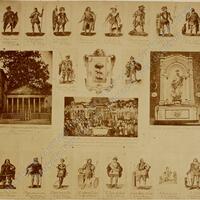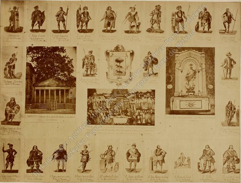 Galería de estampas de los señores de Vizcaya con el escudo del Señorío y tres fotografías que representan el cuadro de la Jura de los Fueros por Fernando el Católico, el Templete de la Casa de Juntas y un detalle del altar dedicado a Nuestra Señora de la Antigua en Guernica. Composición realizada por Carlos Monney hacia 1874.
