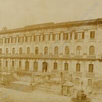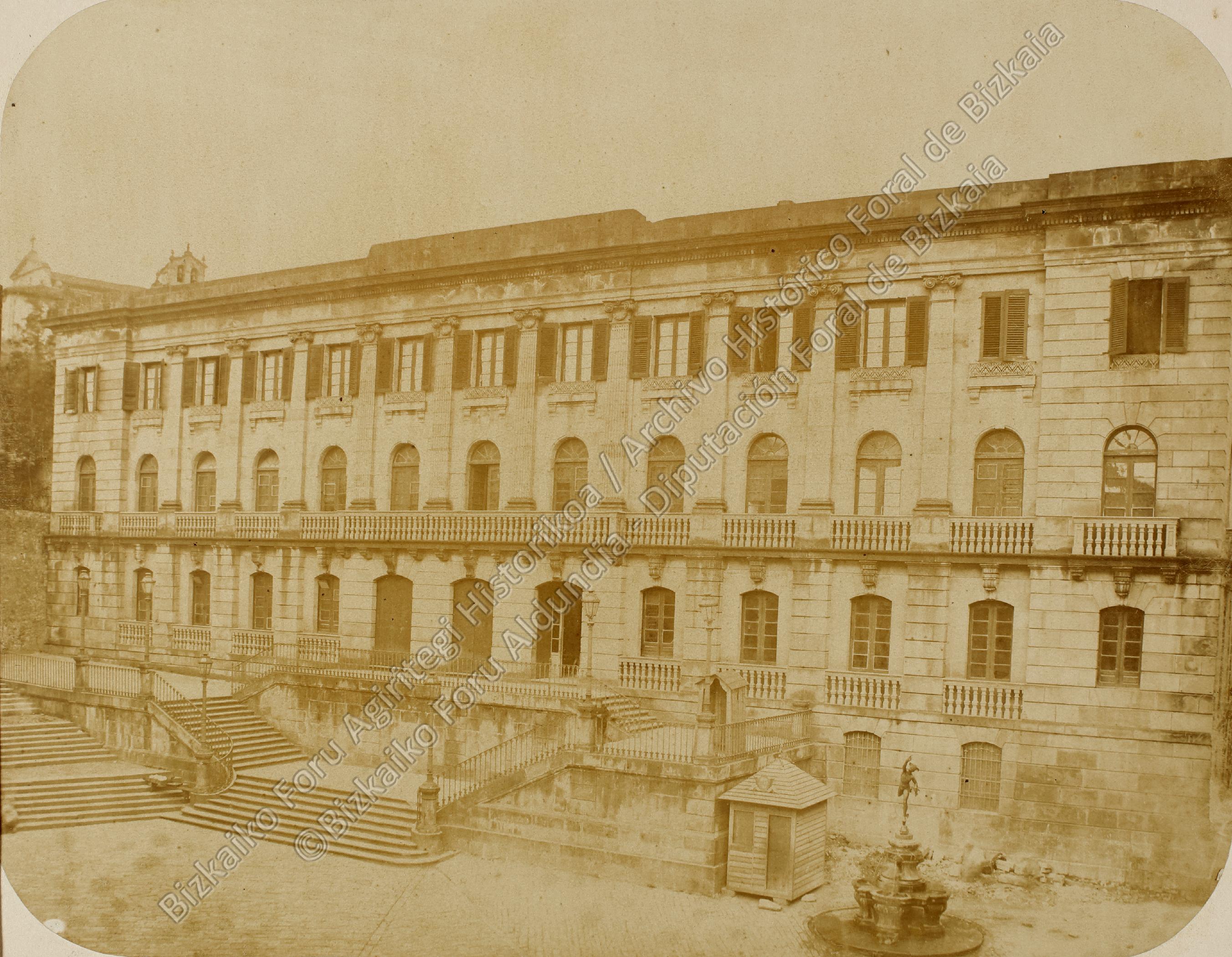 - ES Toma general de la fachada principal del Instituto Vizcaíno en Bilbao. Junto al edificio hay una fuente artística, hoy día instalada en la plaza de San Francisco Javier.