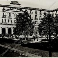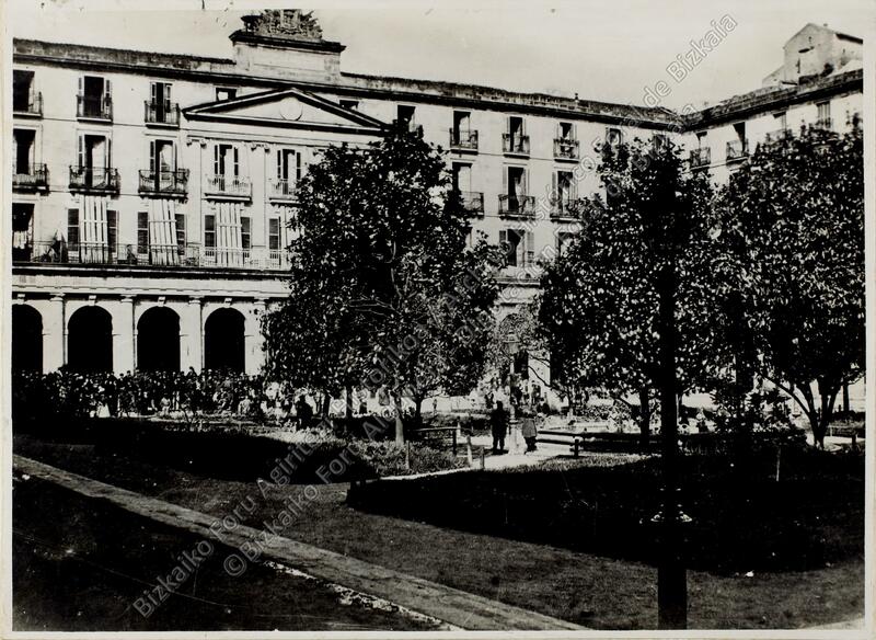 Copia de la toma parcial de la Plaza Nueva de Bilbao durante El Sitio carlista de 1874, en el que destacan la fachada del reloj, sede de la Diputación de Vizcaya, y un grupo numeroso de personas que observan el momento. Toma obtenida por Carlos Monney en 1874. Esta copia se realizó entre 1915 - 1925.