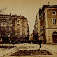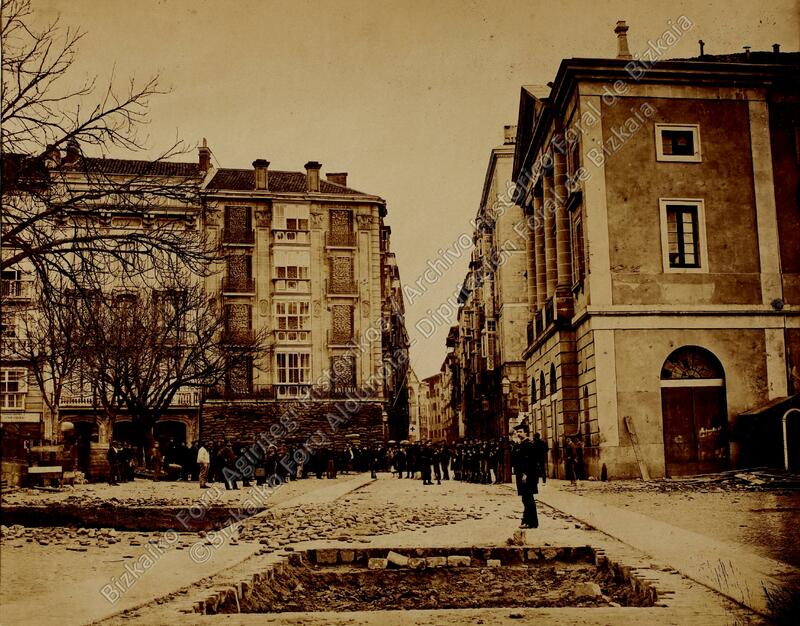 Retrato de grupo de voluntarios auxiliares y otros defensores de El Sitio carlista de Bilbao posando en la plazuela del Teatro de Bilbao; al fondo la calle Bidebarrieta y la fachada del Hotel Antonia cubierta de sacos terreros en El Arenal.