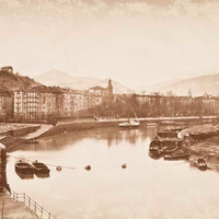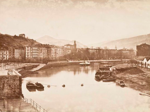 - ES A la izquierda Batería de la Marina, cadena de hierro atravesando el Nervión, barcazas, en invierno por los árboles sin hojas