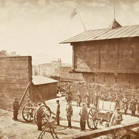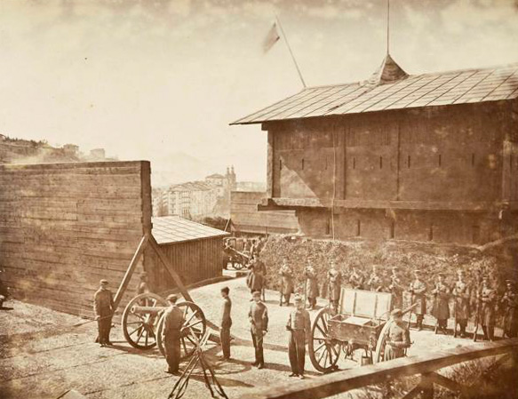 Vista con un grupo de 24 soldados, formados y sirviendo 2 piezas de artillería y carro de transporte. Cubierta con pararrayos y mástil con bandera española ondeando movida. Al fondo casas e iglesia de San Nicolás, del casco antiguo