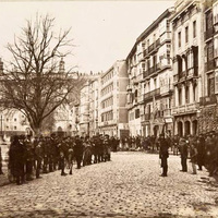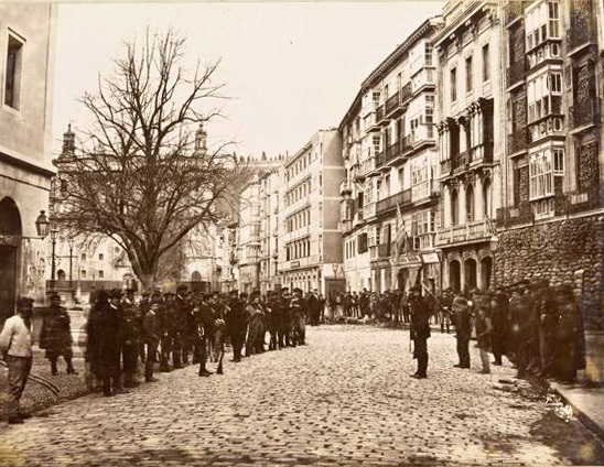 - ES Antiguo Hotel Antonia con sacos de arena, Teatro de la Villa, Iglesia de San Nicolás, árboles sin hojas, soldados o voluntarios, Tabaquería Habana y bandera norteamericana