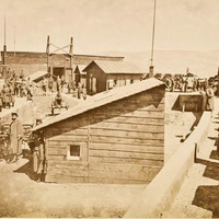 - ES Casetas de madera, soldados de infantería (ver emblema al cuello) con fusiles, dos cañones, más de 60 personas, entre ellas una cantinera con una copa