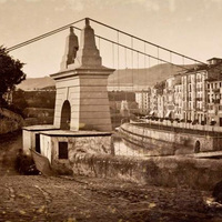 - ES Dos puentes colgantes desaparecidos, y arriba la estación ferroviaria de Bilbao-Abando