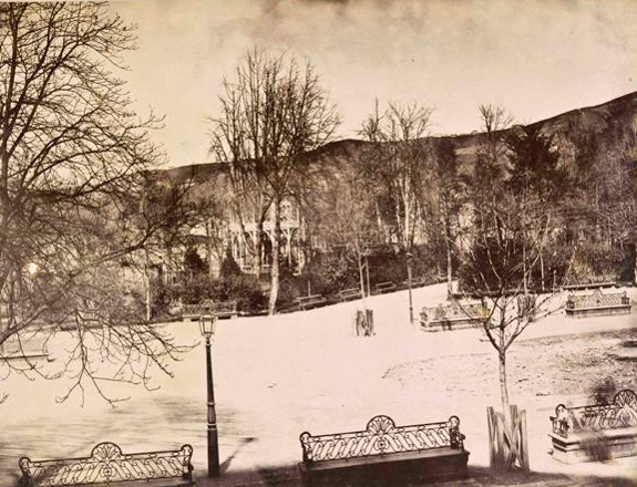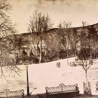 - ES Casi vacío, solamente con 3 personas sentadas movidas; árboles sin hojas, en invierno
