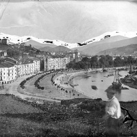 Antes de 1885 Vista tomada desde el actual ayuntamiento de la villa cuando el terreno era una huerta con su labrador, como se puede apreciar en este toma. Destacar las alineaciones de árboles recien plantados de La Sendeja, la frondosidad de El Arenal y al fondo la fachada del Teatro Viejo. Destacar que el muelle de Ripa no está plenamente urbanizado. Cortando el cielo las torres de San Nicolas, San Antón y Santiago.