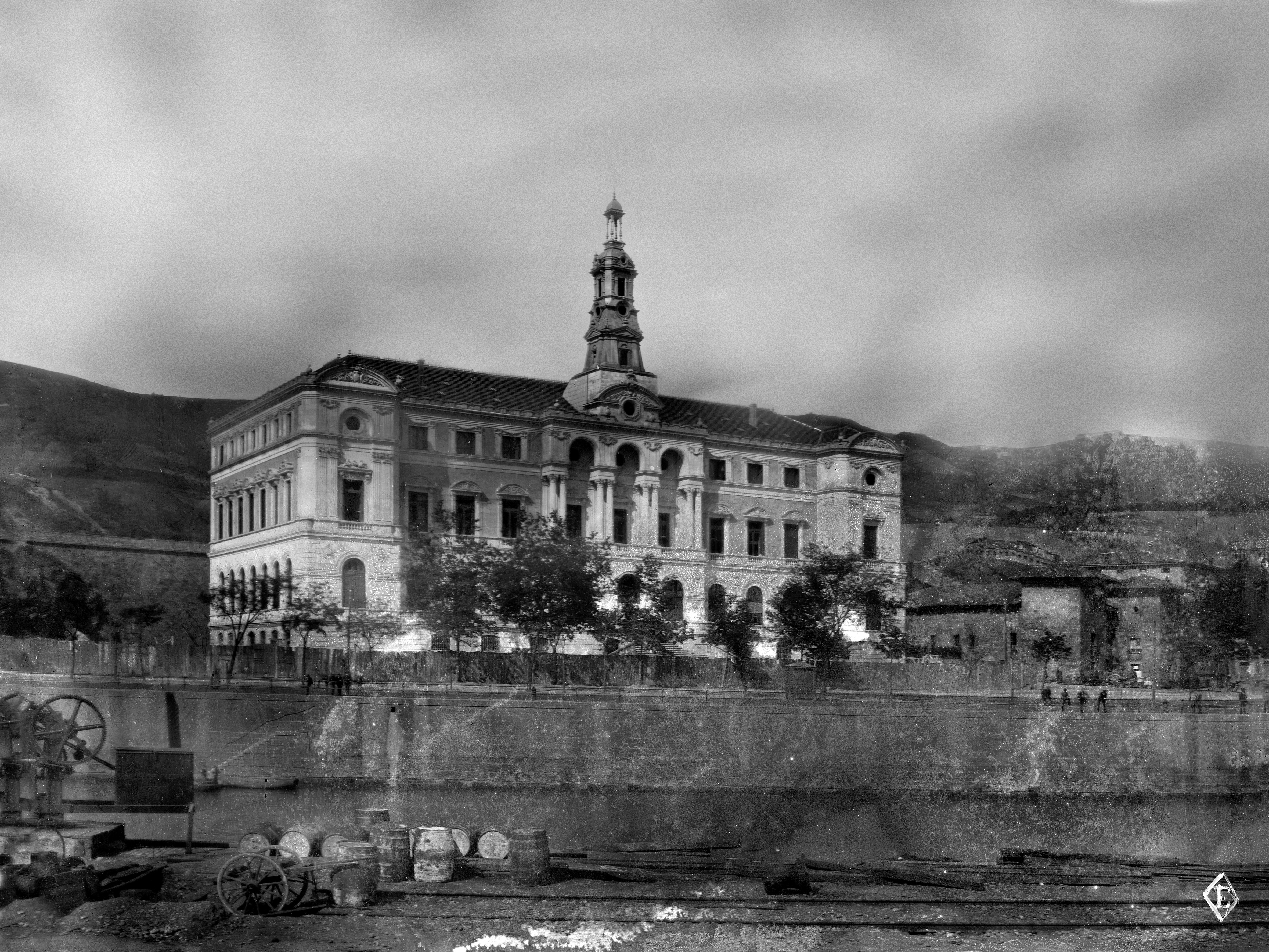 Circa 1892 Exterior. Vista general del actual ayuntamiento de Bilbao que, inaugurado en 1892, se presenta en esta imagen sin finalizar, pues todavía no se ha eliminado la empalizada perimetral. Aún no se ha construido el puente giratorio o del "perro chico" y a la derecha se observa el desaparecido palacio de la familia Quintana Salcedo, anteriormente conocido como palacio Marquina, cuya fachada se ornaba con los magníficos escudos de los linajes Trauco y Marquina, hoy conservados en el Museo Vasco de Bilbao.