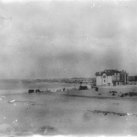 Vista de la playa de Ereaga, o Neguri para otros, con casetas de baños, chalet y edificio de balneario. Al fondo, el puerto pesquero y villas.