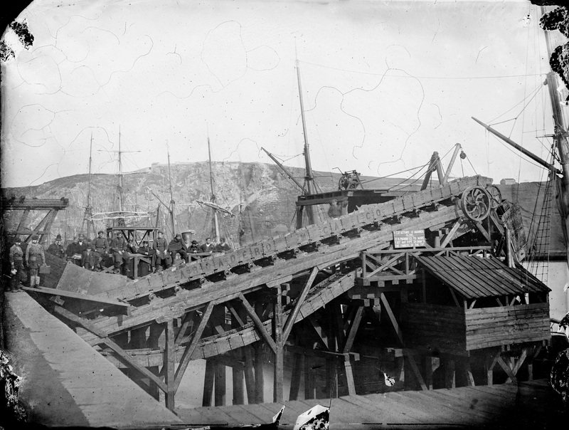 1874 Vista general del cargadero mecánico, segun reza en el propio aparato, en Lutxana - Barakaldo. Tras éste, hombres uniformados posan para el fotógrafo. Sobre la caseta de la derecha, cartel de madera con leyenda en blanco, bilingue, frances e inglés: "IL EST DEFENDU D'AMARRER / AU PONT / IT IS PROHIBITED TO MAKE / FAST ANY ROPE OR CHAIN TO / THE TIMBERS OF THE TIP". Al fondo canteras de Axpe. - Muy semejante ver ERR-047 con identificación de uniformados y también Archivo Foral de Bizkaia AL14/0120 y AL11/075 que se contiene en album de Monney. Esta imagen ha sido reproducida en el calendario 2020, en el mes de octubre, editado por la Autoridad Portuaria de Bilbao /Bilboko Portuko Agintaritza en colaboración con el Museo.