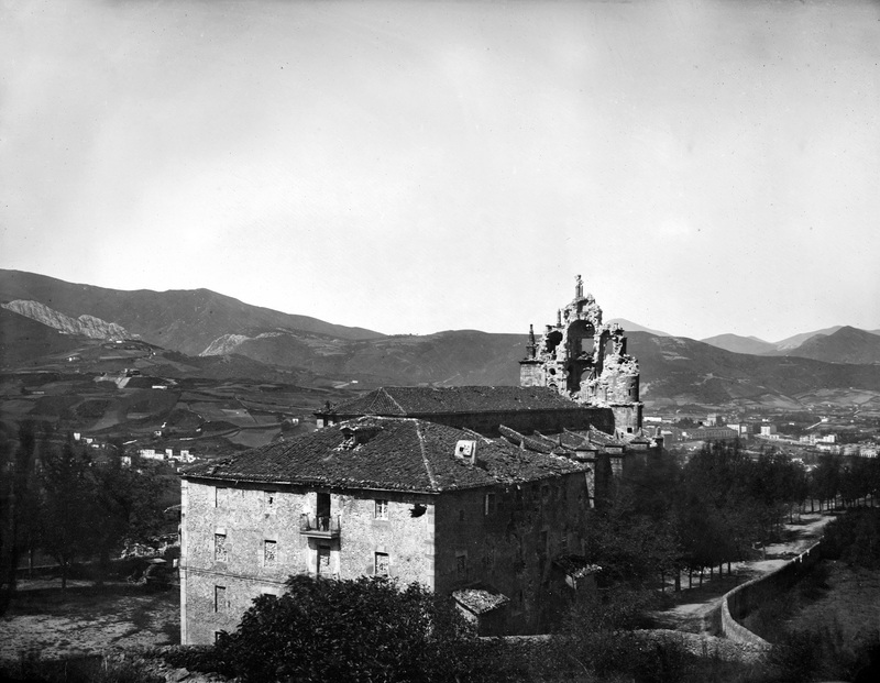 1875 Vista tomada desde el alto de Artagan mostrando en primer término la casa consistorial de la Anteiglesia de Begoña y tras ésta la iglesia mostrando los destrozos causados durante la II Guerra Carlista. Al fondo, el Casco Viejo.
