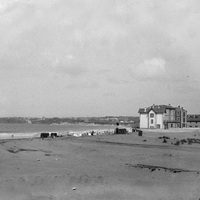 1880 - 1895 Vista de la playa de Ereaga, Algorta, o Neguri para otros, con casetas de baños, chalet y edificio de balneario. Al fondo, el puerto pesquero y villas.