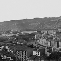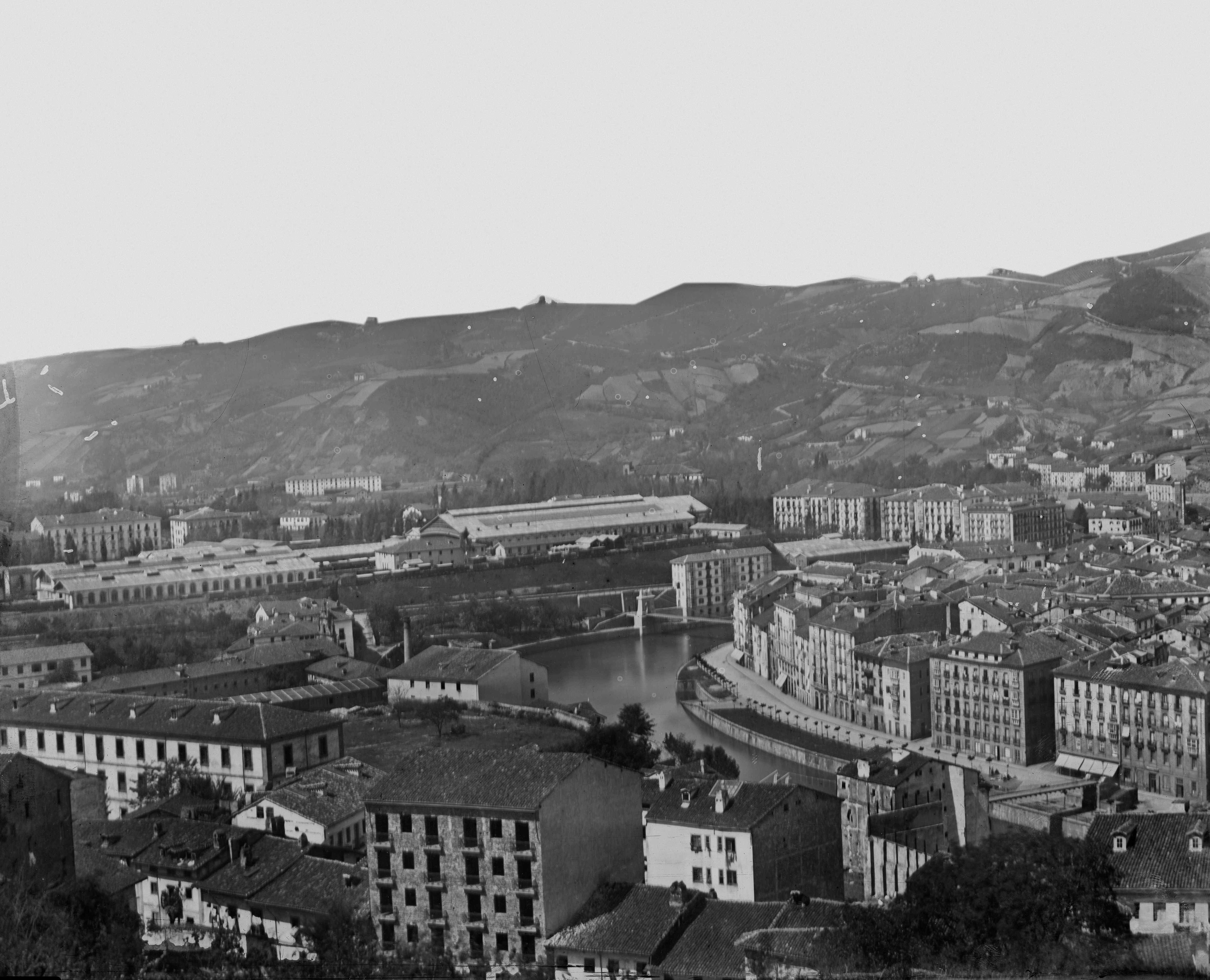 Antes de 1874 Vista desde algun punto de Miribilla donde aparece en primer término parte del barrio de San Francisco, frontón a la derecha y cuartel a la izquierda, la margen derecha de la ría con los puentes de San Francisco y Los Fueros y la calle La Ribera. Cerrando el espacio urbano las instalaciones de la Estación del Norte y al fondo las faldas de Artxanda. - Es panorámica P001, con ERR-003, ERR-035 y ERR-055. - Igual que ERR-024 - En Fototeca Archivo Foral de Bizkaia AL14/1001 es muy semejante y panorámica
