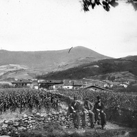 1870-1875 Tres hombres sentados sobre petril de huerto de maiz. Tras ellos la villa de Elorrio. De Luis Madina (3-12-2004): 1- Palacio Gonzalez. 2- Colegio Lourdes, en esta fecha baños. 3- Posiblemente Palacio Tola. 4- Caserío Belengua 5- Carretera a Elgeta 6- Monte Erdeia