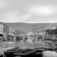 1875 Vista desde el muelle de La Ribera donde se aprecia gabarras en el cauce, las rampas, grua de puerto... El puente nos aparece con parte de su estructura dañada por la riada sufrida en 12-04-1874 al soltarse las amarras de las gabarras y chocar contra los pilares del puente.