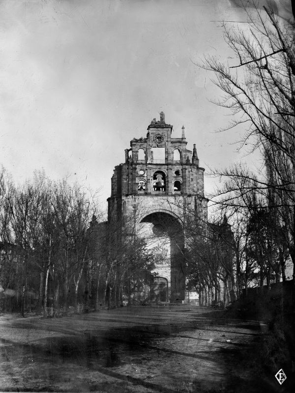 1875 - 1880 Vista general de la fachada pricipal de la iglesia de Begoña tomada desde la campa. La torre se presenta destruida debido a los reiterados bombardeos que sufrió. Las obras de restauración comenzarón en 1881 según proyecto del arquitecto Atanasio Anduiza.