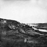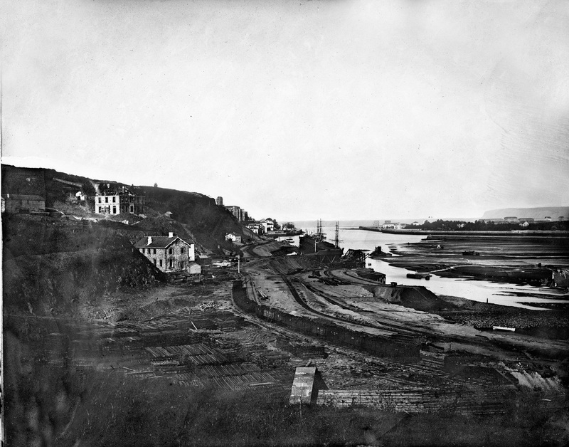 Antes de 1880 Vista de la desembocadura del Nervión con la la dársena de la Benedicta a la derecha. En primer término almacen de maderas y obras que parecen responder a la construcción del ferrocarril minero. En la ladera construyendo el chalet para el ingeniero de la cia inglesa