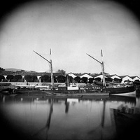 c. 1870 Vista del final del muelle de Ripa y comienzo del de Uribitarte con las instalaciones portuarias conocidas como "casa de la locomotora", obra del arquitecto municipal Francisco de Orueta. Todavía no se ha trazado el muelle para el encauzamiento de la ría y aparece un ramal de mercancias para el transporte de mineral de las minas de Ollargan que conectaba con el ferrocarril de la estación del Norte. A la derecha de la imagen, barco en construcción en un astillero de ribera.