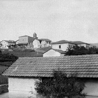 1880 - 1895 Vista general del nucleo urbano de Zaldibar presidido por la iglesia de San Andrés. Tras el tejado de la casa en primer término, loscalizamos en la parte alta de la siguiente casa un letrero anunciador: "FONDA DE JUAN Ma. De BENGOA LAPICO". Juan Bengoa era natural de Durango donde tambien tenía fonda en la plaza Ezkurdi y "lapico" era el apodo.